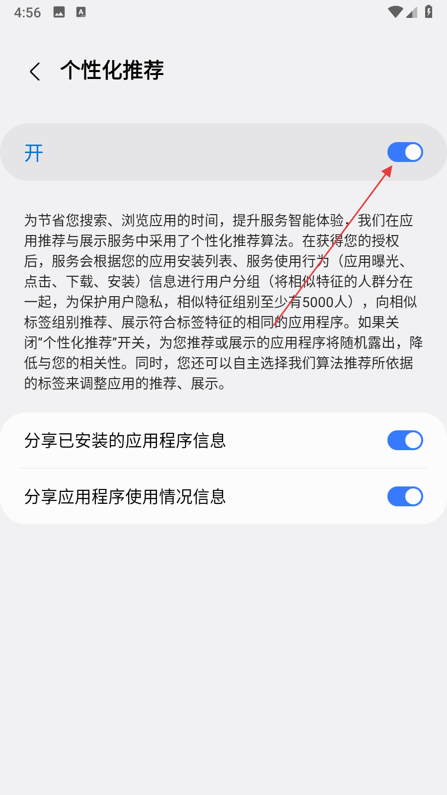 4、在個性化推薦頁面,點擊開對應的開關按鈕,將其關閉。