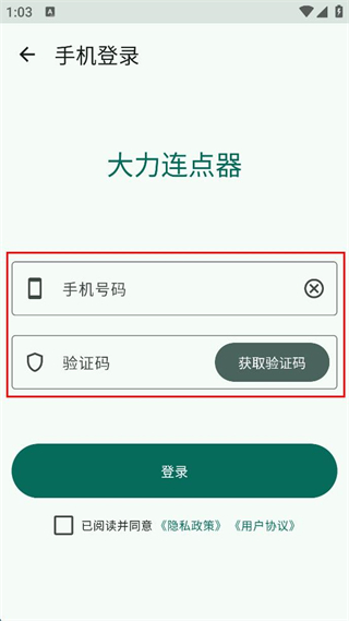 1、打開大力連點器APP,點擊“手機登錄”進入手機登錄頁面。