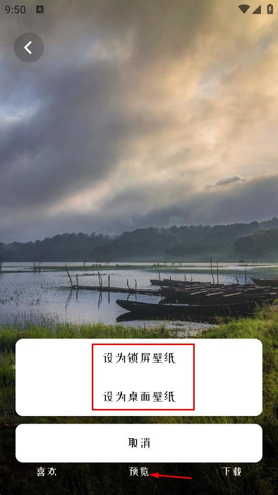 3、在壁紙?jiān)斍轫?yè)面,點(diǎn)擊“預(yù)覽”按鈕,查看壁紙效果,之后在彈出的選項(xiàng)中,選擇“設(shè)為鎖屏壁紙”或者“設(shè)為桌面壁紙”,按照軟件提示完成后續(xù)操作,即可將這張壁紙?jiān)O(shè)置好。