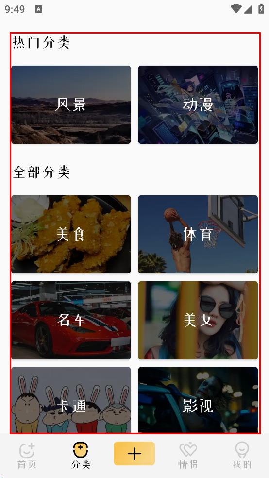 1、打開(kāi)壁紙軟件,進(jìn)入軟件界面,在界面中找到“分類”選項(xiàng)并點(diǎn)擊,進(jìn)入分類頁(yè)面后,在分類里點(diǎn)擊想要瀏覽的類別,點(diǎn)擊該選項(xiàng),進(jìn)入壁紙展示頁(yè)面。