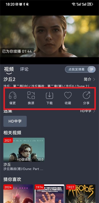 2、點擊作品就可以進入到【播放頁面】,在播放頁面中用戶可以看到相關(guān)的影視內(nèi)容介紹、下載方式、還有相關(guān)的視頻內(nèi)容;