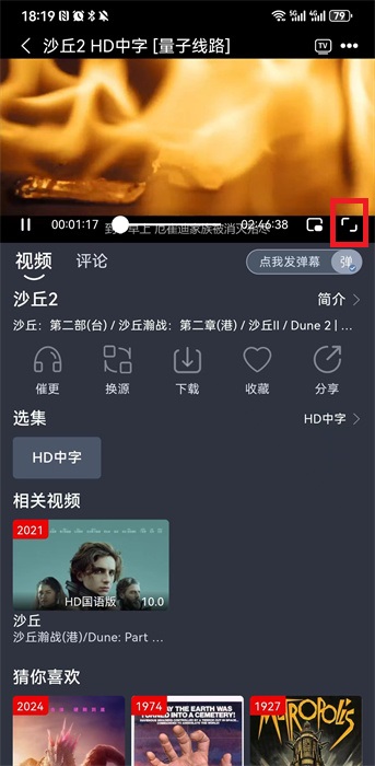 3、如果豎屏觀看不方便,還可以點擊播放界面,在彈出的功能中點擊右下角的【放大】按鈕,橫屏觀看影視內(nèi)容;