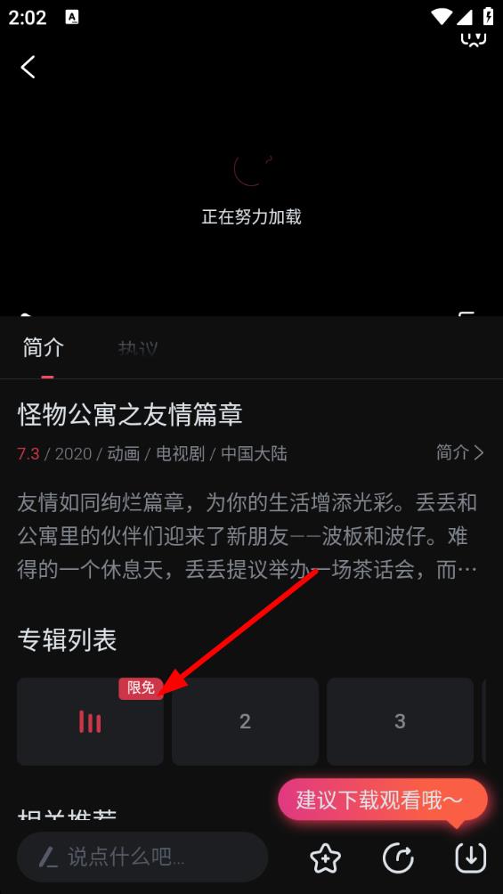3、點(diǎn)擊帶有限免標(biāo)識(shí)的影片,進(jìn)入播放頁面,在專輯列表中點(diǎn)擊對(duì)應(yīng)集數(shù),即可免費(fèi)播放觀看。