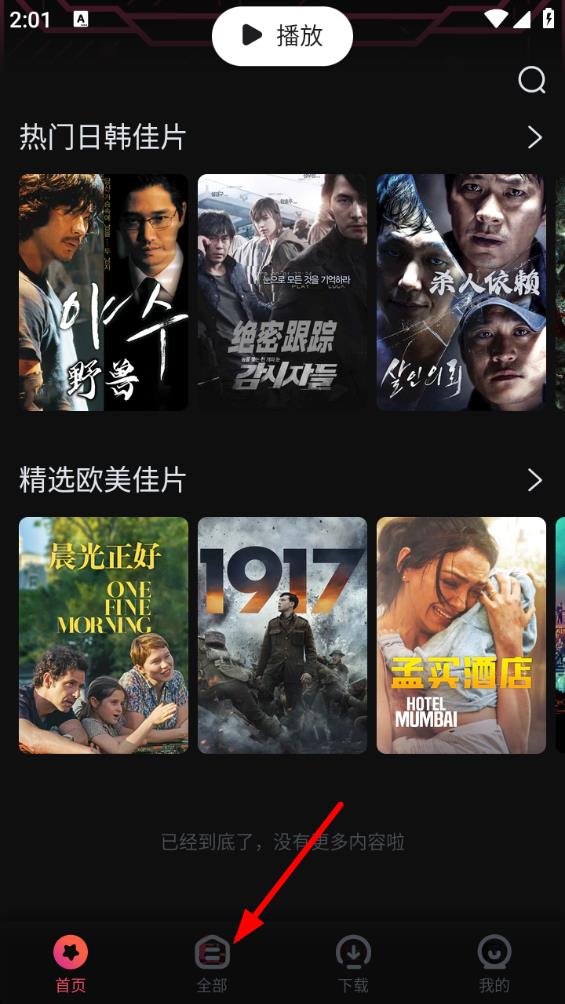 1、打開柿子電影app,進(jìn)入首頁,點(diǎn)擊底部導(dǎo)航欄中的全部選項(xiàng),瀏覽各類影片資源。