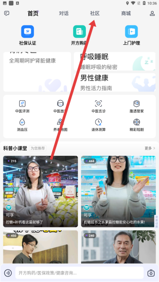 1、在老來健康app的主頁面中,點擊頂部的社區(qū)按鈕,跳轉(zhuǎn)到社區(qū)頁面。