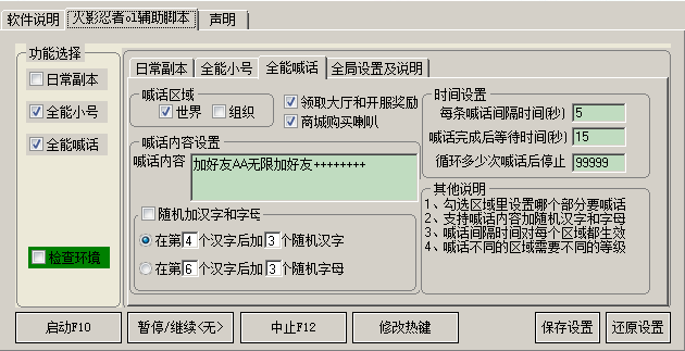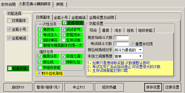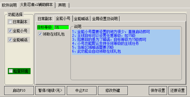 全能小號功能設置:糖果火影忍者ol輔助工具的全能小號功能:不需要設置很多東西,直接啟動即可。主線目標可以設置任意等級,如15級。如果只是為了喊話,目標等級設為15級即可。同時可以領取在線禮包。
