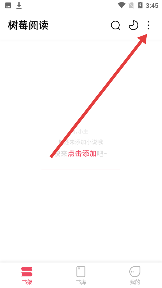 1、打開(kāi)樹(shù)莓閱讀APP,進(jìn)入書(shū)架頁(yè)面,找到右上角月亮圖標(biāo)右邊的三點(diǎn)圖標(biāo)。