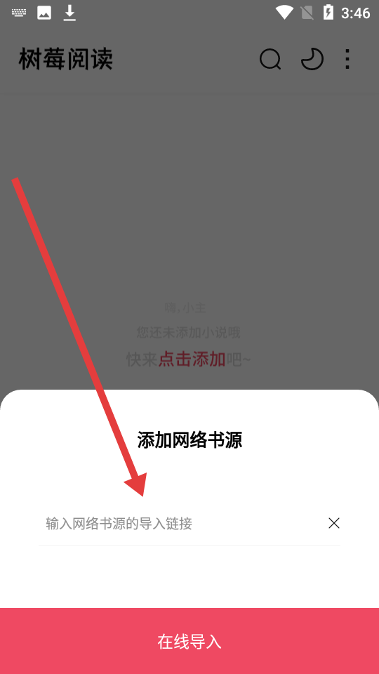 3、隨后進(jìn)入添加網(wǎng)絡(luò)書(shū)源界面,可以通過(guò)輸入書(shū)源鏈接,完成書(shū)源的導(dǎo)入。