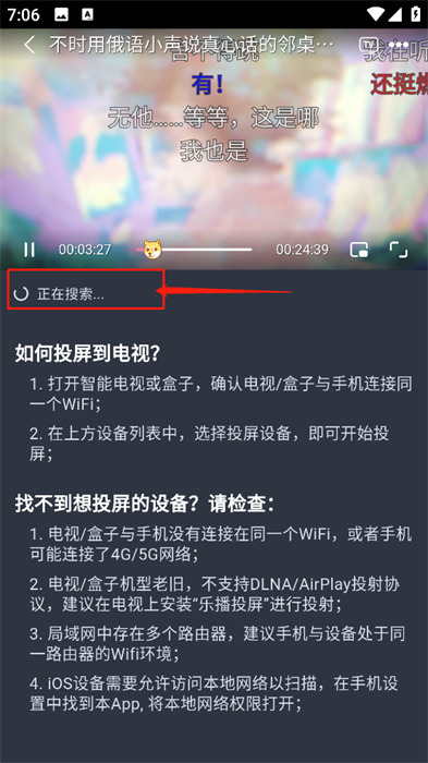 4、最后,你能看到正在搜索周圍設(shè)備的頁面,并且下方還有一些常見問題的描述,如果是同時連接同一個無線網(wǎng)絡(luò)一定能順利投屏。