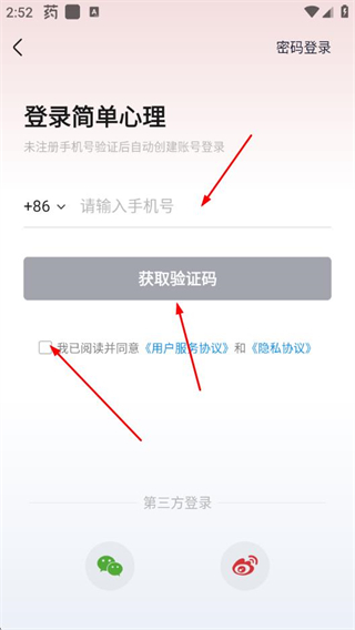 3、在登錄頁面輸入手機號,勾選用戶協(xié)議后點擊獲取驗證碼,獲取對應(yīng)的短信驗證碼。