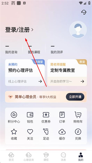2、在個人中心頁面點擊登錄/注冊選項,進入登錄簡單心理頁面。