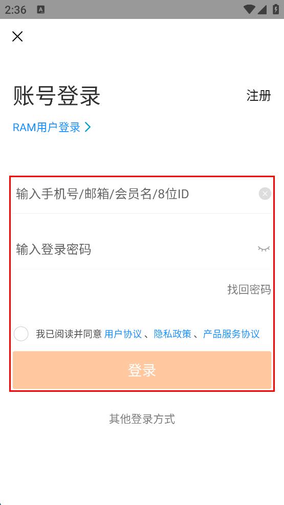 4、在賬號(hào)登錄頁面輸入手機(jī)號(hào)或郵箱等賬號(hào)信息,輸入登錄密碼,勾選已閱讀并同意相關(guān)協(xié)議,點(diǎn)擊登錄按鈕完成登錄。