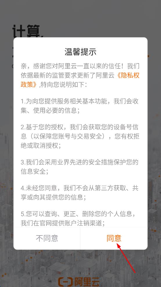 1、打開阿里云App,出現(xiàn)溫馨提示彈窗,閱讀后點(diǎn)擊同意按鈕。