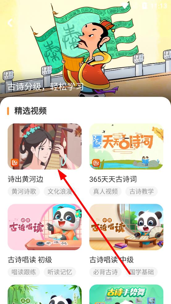 3、進入古詩頁面后,在精選視頻板塊,選擇喜歡的古詩視頻或唱讀內(nèi)容,點擊即可播放收聽。