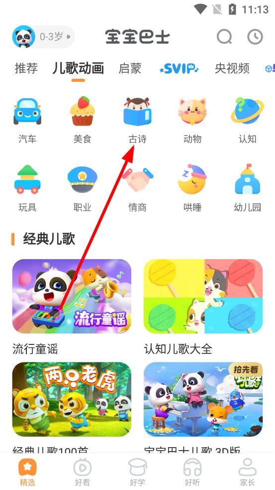 1、打開寶寶巴士App,點擊底部導(dǎo)航欄中的精選選項。