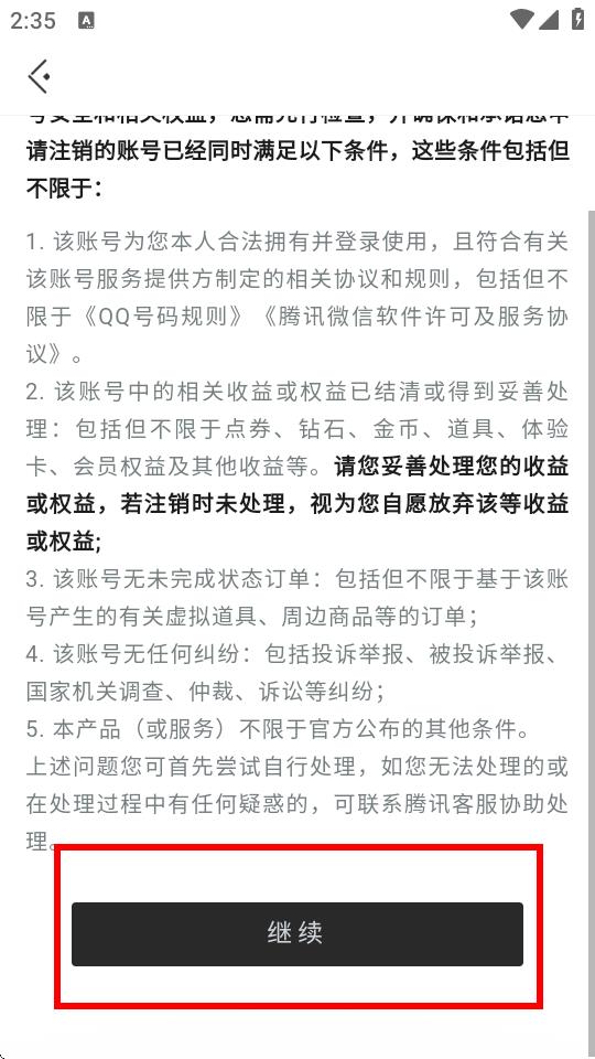 3、仔細閱讀注銷賬號需滿足的條件,確認滿足后點擊繼續(xù)。