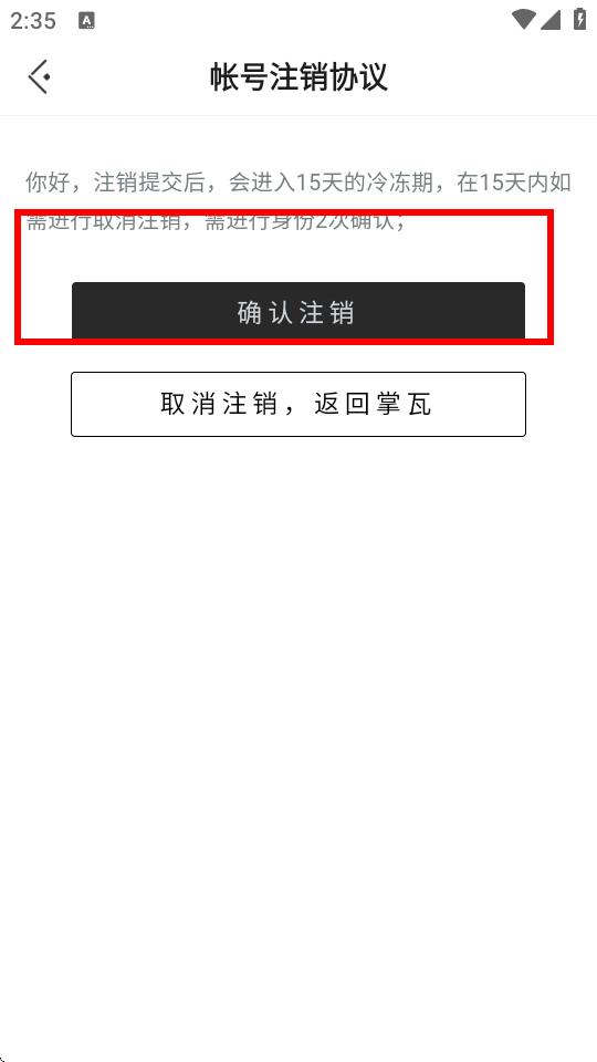 4、在賬號注銷協(xié)議頁面,確認要注銷賬號則點擊確認注銷,提交注銷申請后賬號會進入15天冷凍期,期間若取消注銷需進行身份二次確認。