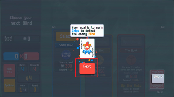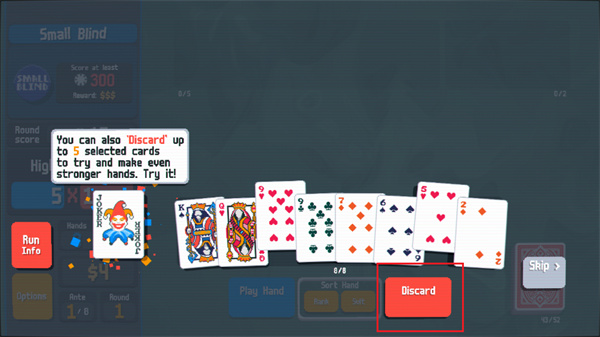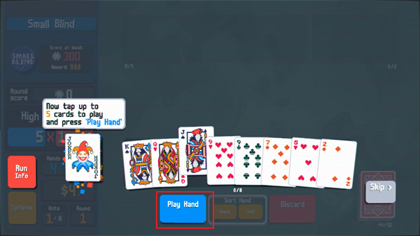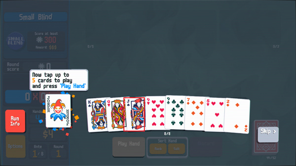 小丑牌中文版將采用最基礎的撲克牌組成游戲內容,但是在這里不僅僅是簡單的撲克玩法,將會帶來更加燒腦的牌型組合玩法,讓我們能夠使用牌面上所有的牌去組成最高分的陣型,比如同花順或者是對子、順子等等牌型,都可以獲得不同的分數(shù),你的任務是通過出牌或者是棄牌拿到足夠的分數(shù)就可以獲得勝利。