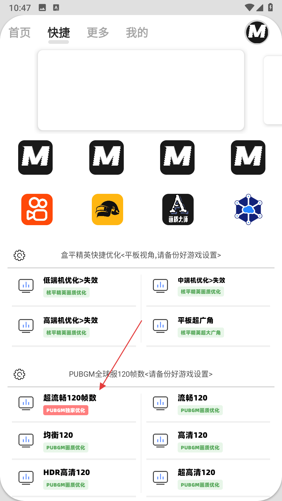 2、在快捷功能頁面中,找到PUBGM全球服120幀數(shù)板塊,選擇需要的幀率選項,點擊該選項。