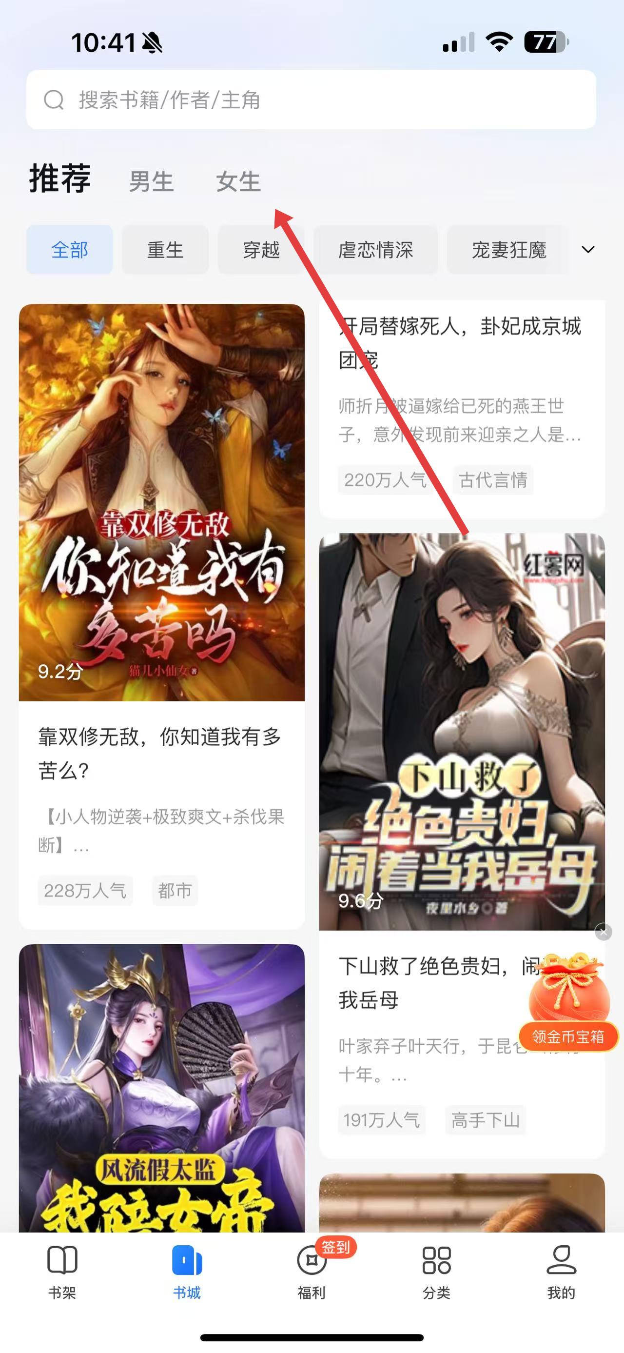2、在書城界面,點(diǎn)擊上方的女生選項(xiàng),進(jìn)入女生小說推薦頁面。