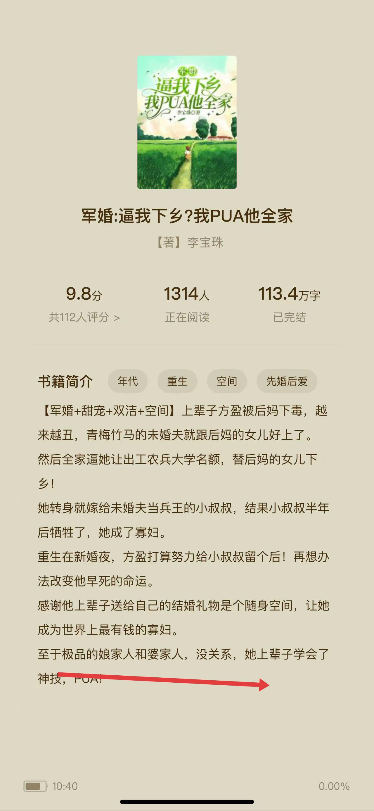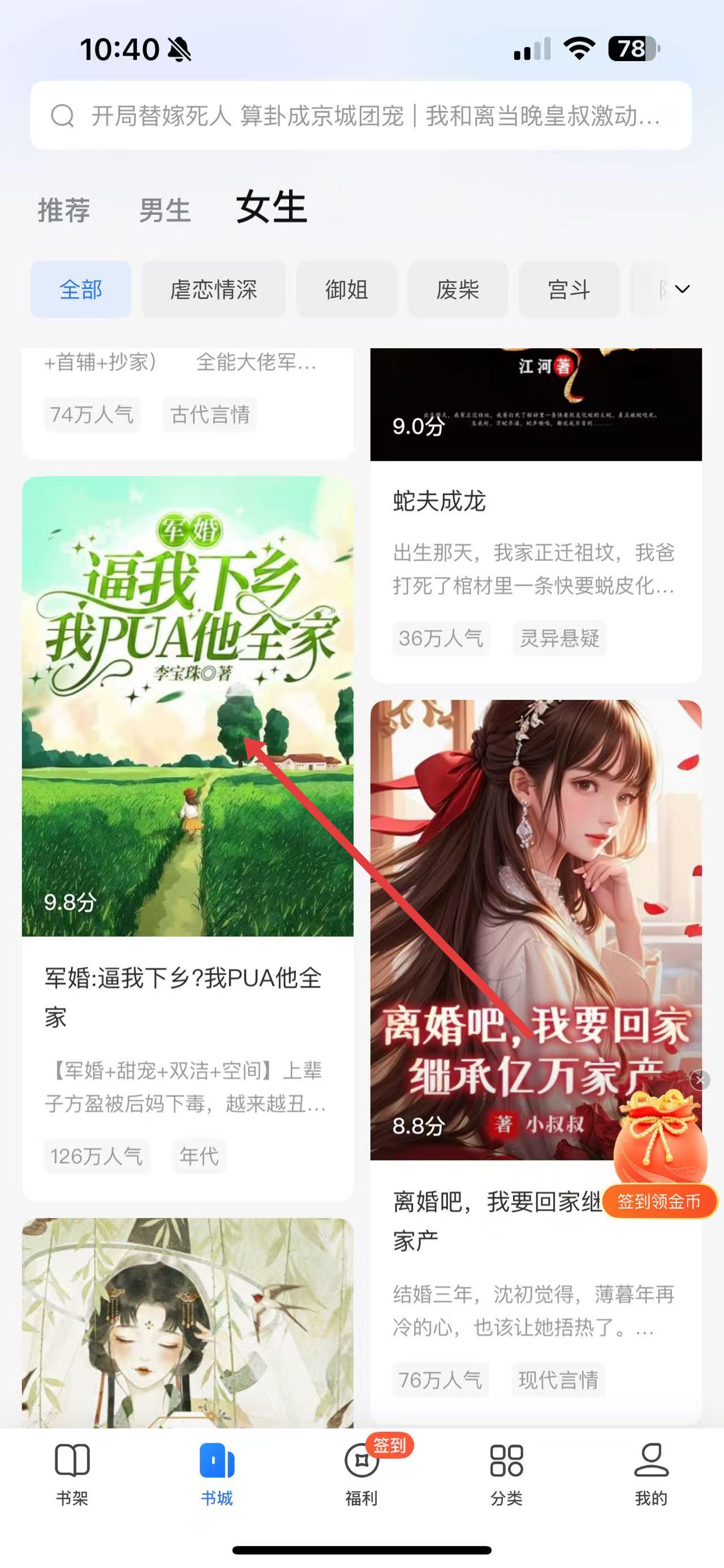 3、在女生小說推薦頁面,選擇軍婚:逼我下鄉(xiāng)?我PUA他全家這本小說,進(jìn)入其介紹頁面。