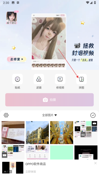 1、打開(kāi)日雜相機(jī)APP,在主界面點(diǎn)擊拼圖功能按鈕,進(jìn)入拼圖準(zhǔn)備環(huán)節(jié)。