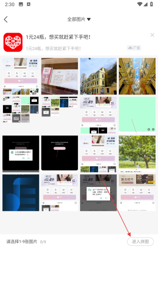 2、在圖片選擇界面,挑選1-9張需要拼圖的圖片,選好后點(diǎn)擊進(jìn)入拼圖按鈕。