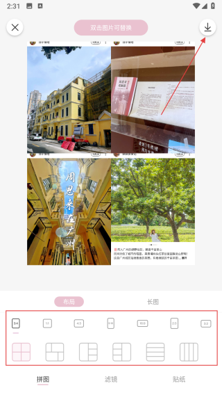 3、進(jìn)入拼圖編輯界面,選擇心儀的拼圖布局樣式,也可添加濾鏡、貼紙等效果優(yōu)化拼圖,右上角是保存按鈕。