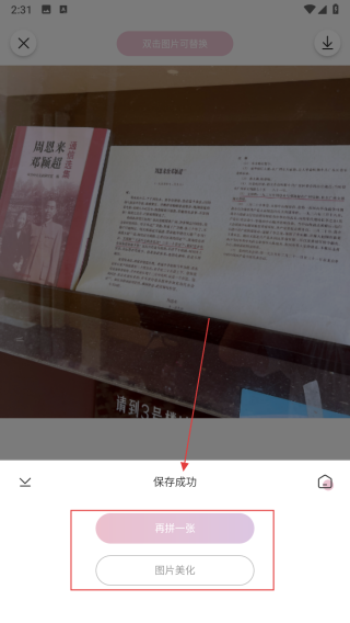4、調(diào)整滿意后,點(diǎn)擊右上角的下載按鈕,將拼好的圖片保存到相冊(cè),保存成功后可選擇再拼一張或圖片美化等操作。