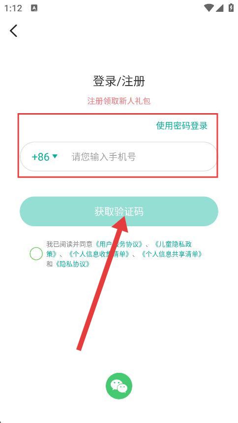 3、在登錄/注冊(cè)界面,輸入您的手機(jī)號(hào),然后點(diǎn)擊獲取驗(yàn)證碼按鈕。