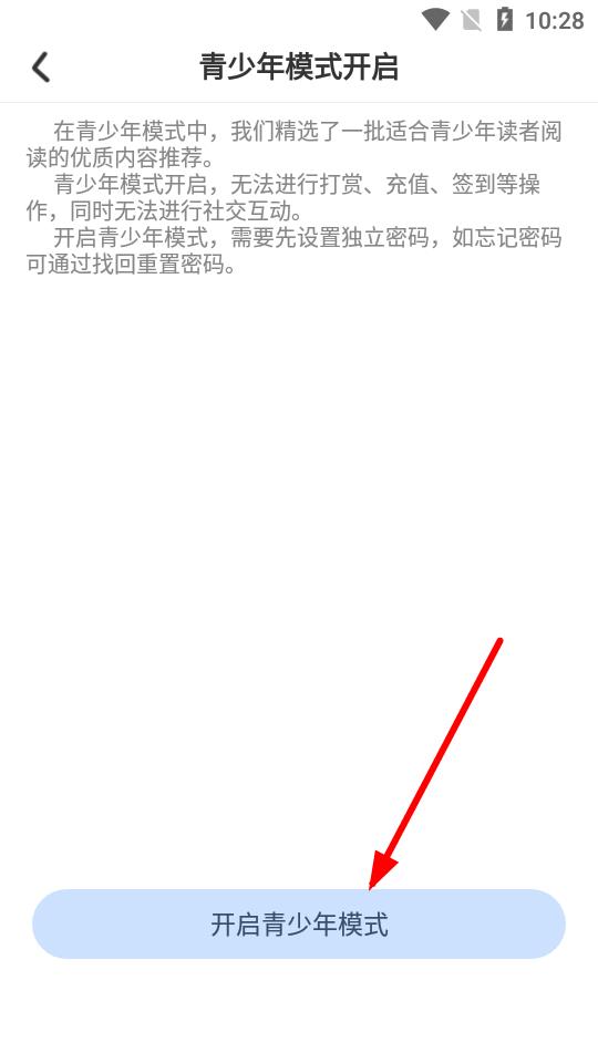 4、在青少年模式設置頁面,點擊開啟青少年模式按鈕,按提示設置獨立密碼后即可成功開。