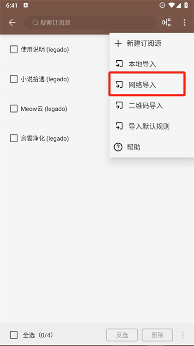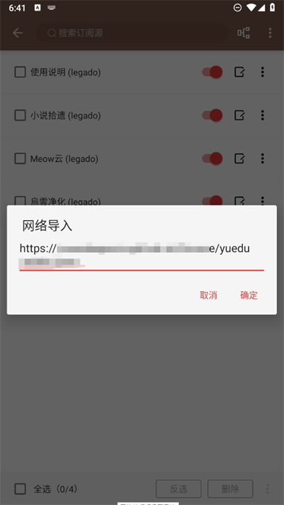 4、進入網(wǎng)絡導入后選擇需要導入的書源,直接將網(wǎng)址放置到網(wǎng)絡導入的連接處點擊確認即可;