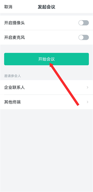 2、在發(fā)起會(huì)議頁(yè)面,點(diǎn)擊開始會(huì)議,即可創(chuàng)建并進(jìn)入會(huì)議。