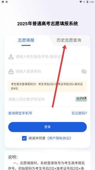 1、在進(jìn)入到八桂高考登錄頁(yè)面,可以選擇歷史志愿查詢進(jìn)行登錄。