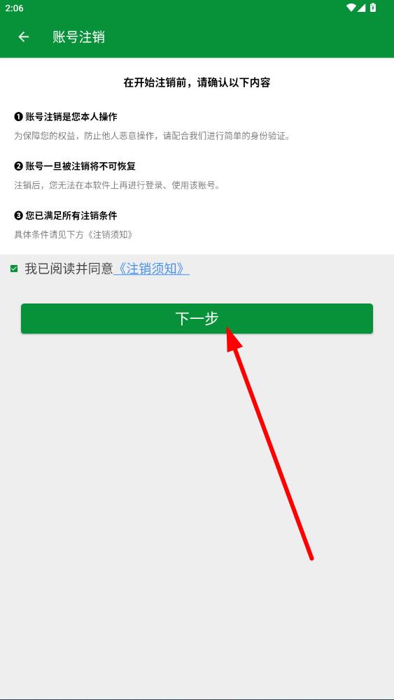 4、在賬號注銷頁面,閱讀相關(guān)內(nèi)容后,然后點(diǎn)擊下一步,按照提示完成身份驗證等操作,即可注銷賬號。