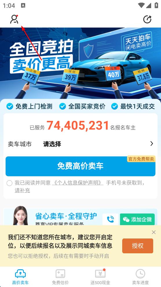 1、打開天天拍車App,點(diǎn)擊頁(yè)面左上角的個(gè)人圖標(biāo)。