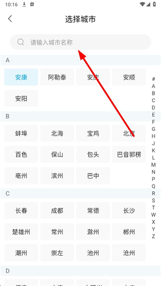 3、點(diǎn)擊所在城市選項(xiàng),進(jìn)入選擇城市頁(yè)面后輸入或選擇所在城市。