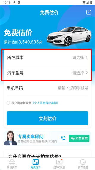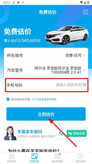 5、輸入手機(jī)號(hào)碼,勾選已閱讀并同意個(gè)人信息保護(hù)聲明后,點(diǎn)擊立刻估價(jià)按鈕,即可完成免費(fèi)估價(jià)操作。