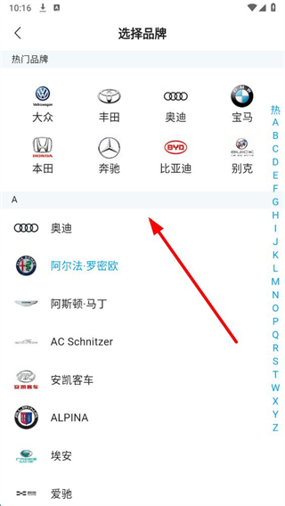 4、點(diǎn)擊汽車型號(hào)選項(xiàng),進(jìn)入選擇品牌頁(yè)面后選擇汽車品牌和具體型號(hào)。