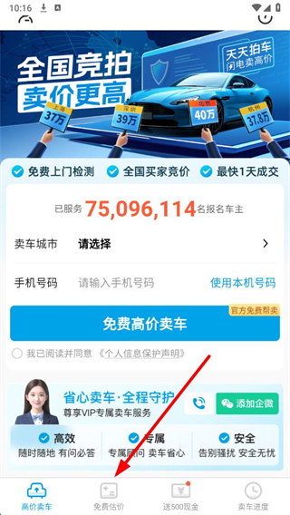 1、在app底部導(dǎo)航欄,找到免費(fèi)估價(jià)選項(xiàng)并點(diǎn)擊,進(jìn)入免費(fèi)估價(jià)頁(yè)面。