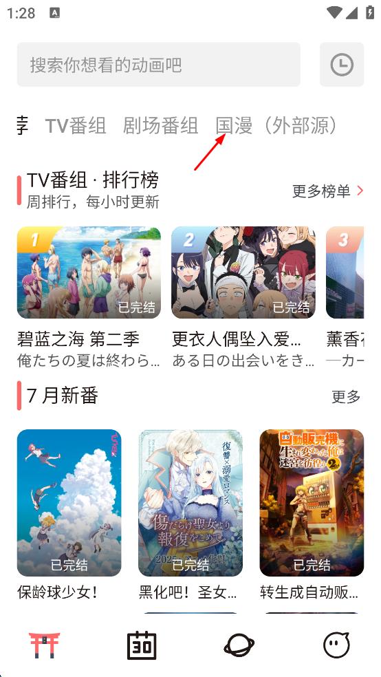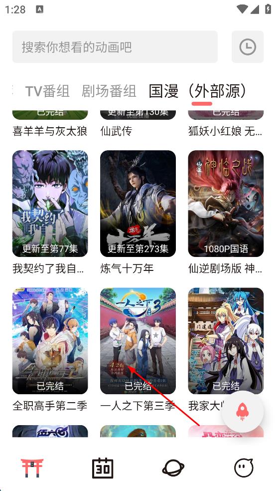 1、打開動漫類APP,在頁面上方找到“國漫外部源”選項,點擊進入國漫展示頁面。
