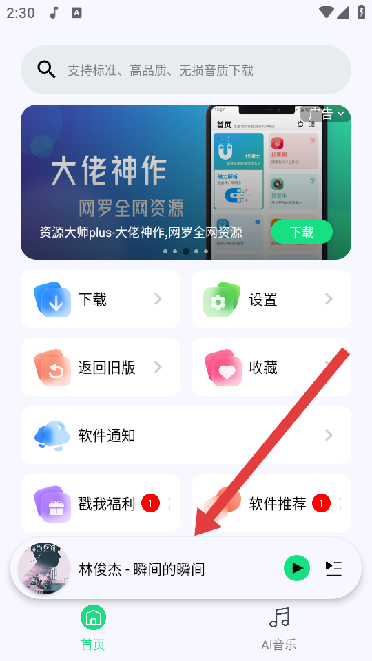 1、在聽下Plus首頁,點擊正在播放的音樂條,進入音樂播放界面。