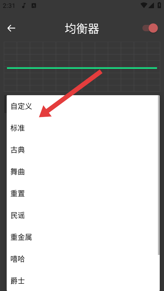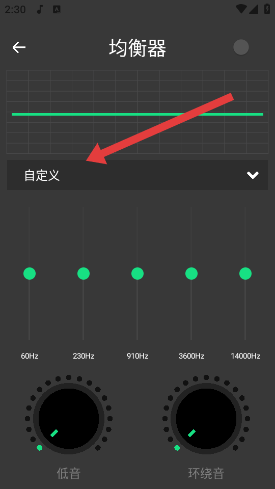 3、在均衡器頁面,點擊自定義下拉選項,展開音效模式的列表。