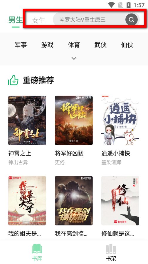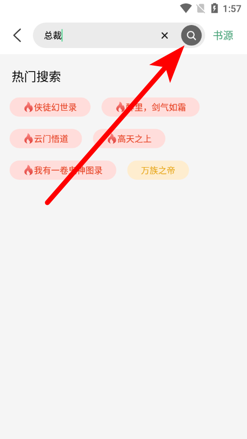 2、在搜索欄中輸入想查找書(shū)籍的關(guān)鍵詞,如小說(shuō)類型或書(shū)名,輸入完成后點(diǎn)擊搜索按鈕。