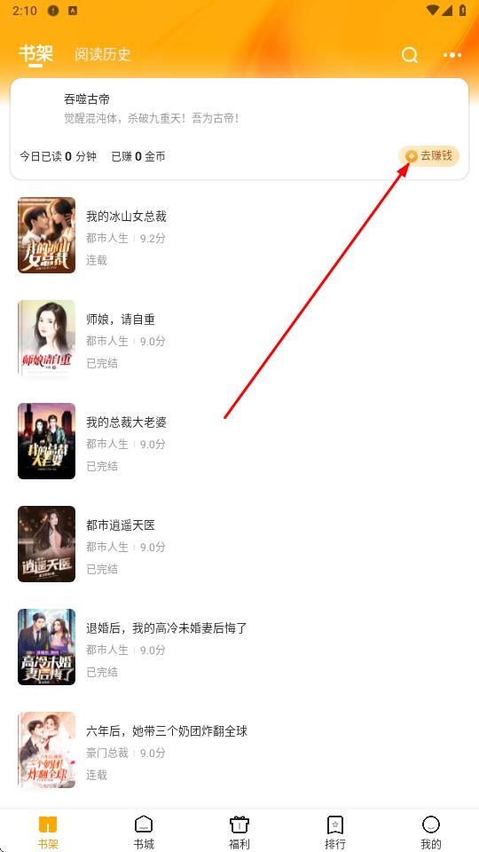 1、在書架頁面中,找到目標(biāo)書籍如吞噬古帝,點(diǎn)擊其右側(cè)的去賺錢按鈕,參與閱讀賺金幣等賺錢活動(dòng) 。