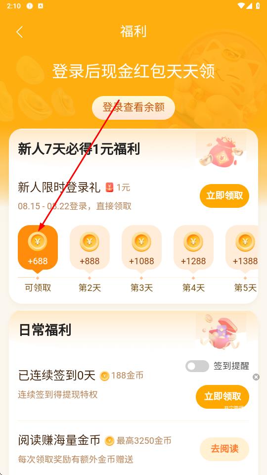 2、進(jìn)入福利頁面后,點(diǎn)擊登錄,領(lǐng)取新人限時(shí)登錄禮首日可領(lǐng)+688金幣 ,還可參與日常福利的簽到領(lǐng)金幣等活動(dòng) 。