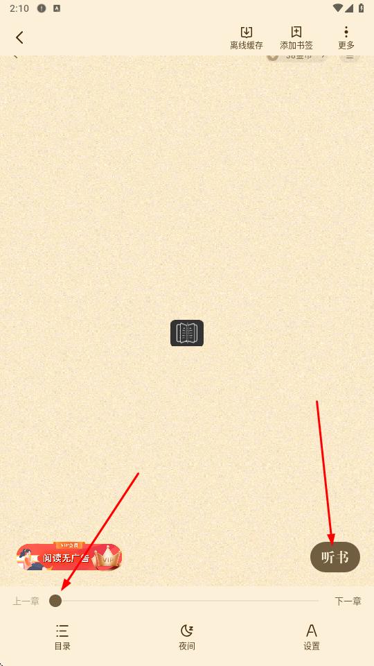3、在閱讀書籍時(shí),點(diǎn)擊頁面右側(cè)的聽書按鈕,可切換為聽書模式;點(diǎn)擊底部的目錄按鈕,能查看書籍章節(jié)列表,方便跳轉(zhuǎn)閱讀 。