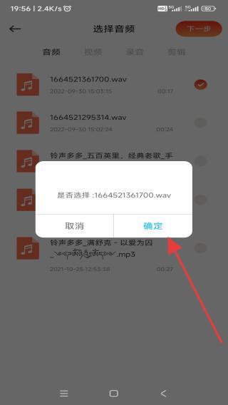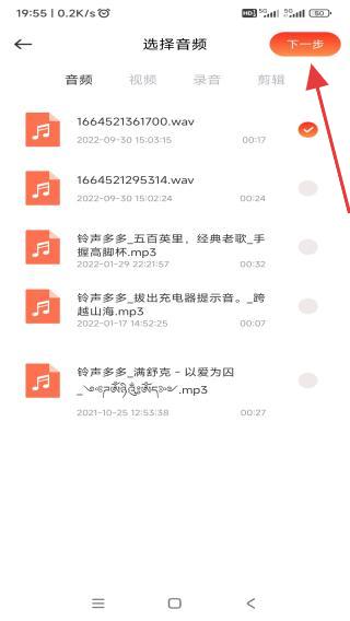 2、在選擇音頻的界面內(nèi),選擇好后點擊下一步的按鈕。