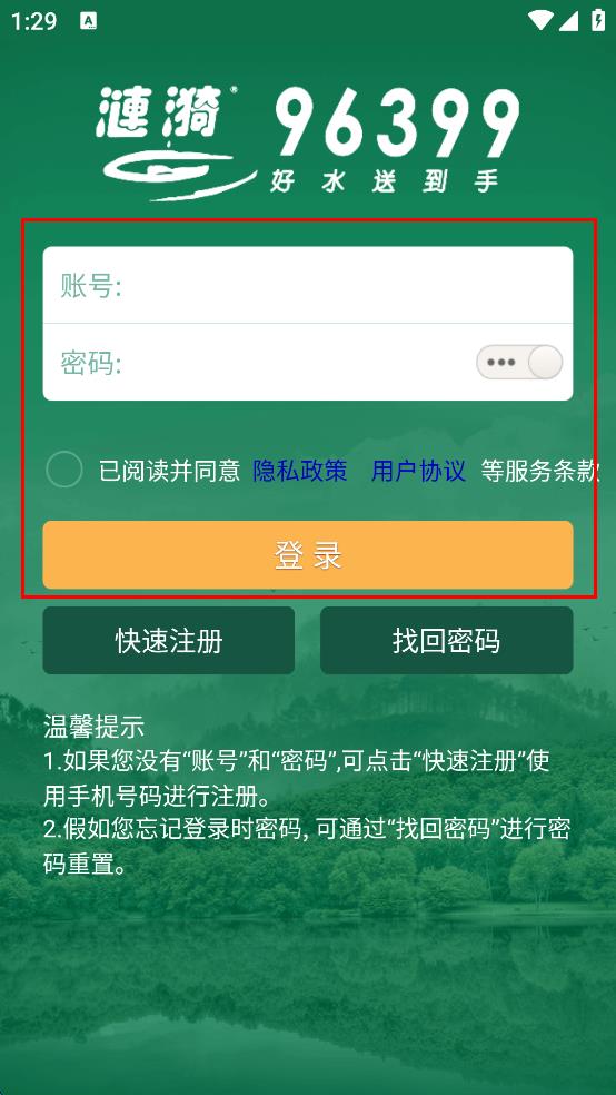 4、在登錄頁面,輸入賬號(hào)和密碼,勾選已閱讀并同意相關(guān)服務(wù)條款選項(xiàng),點(diǎn)擊登錄按鈕,完成賬戶登錄。