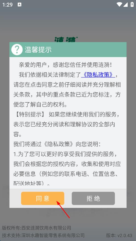1、打開漣漪APP,在溫馨提示彈窗中,點(diǎn)擊同意按鈕,進(jìn)入主界面。